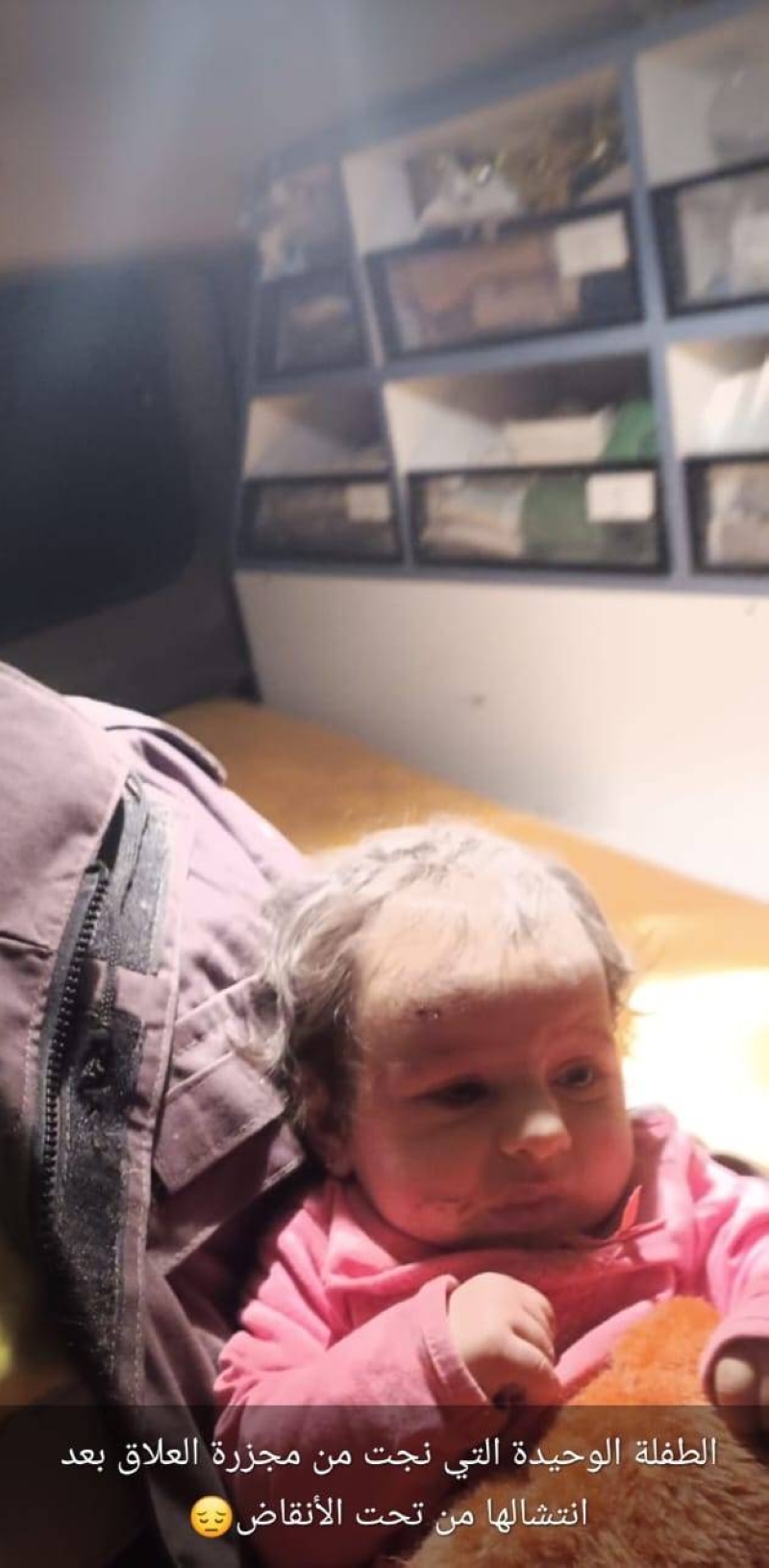 وشارك محافظ بعلبك – الهرمل بشير خضر، أمس، على حسابه في منصة «إكس»، صورة لطفلة رضيعة، مؤكداً أنها الناجية الوحيدة من المجزرة الإسرائيلية التي ارتكبت في بلدة العلّيق.