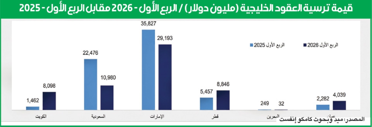 وشهدت عملية اسناد العقود في السعودية تراجعاً حاداً بنسبة 51.1 في المئة على أساس سنوي، لتصل إلى 11 مليار دولار خلال الربع الأول من عام 2026، مقابل 22.5 مليارا في الفترة المماثلة من عام 2025. وعلى النقيض من ذلك، قفزت قيمة المشاريع المسندة في الكويت بأكثر من خمسة أضعاف لتبلغ 8.1 مليارات دولار، مقابل 1.5 مليار في الربع المماثل من العام السابق.