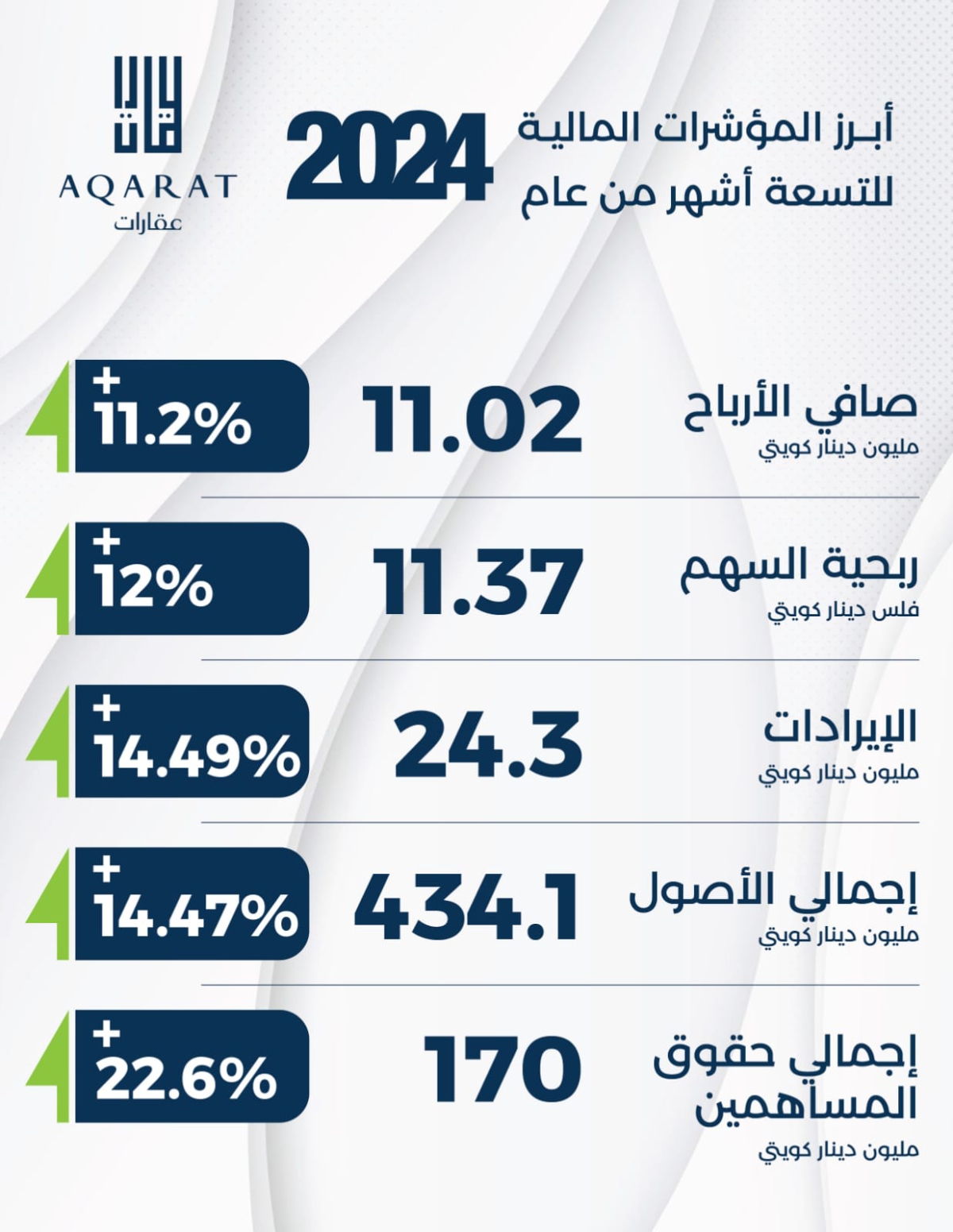 اعتمد مجلس إدارة شركة عقارات الكويت نتائج الشركة المالية عن الأشهر التسعة من العام الحالي، وأظهرت نمواً في أرباح الشركة بنسبة 11.25 بالمئة، مقارنة بالفترة ذاتها من العام الماضي، محققة أرباحاً صافية بلغت 11.02 مليون دينار، أي بربحية 11.37 فلساً للسهم، مقارنة بأرباح 9.9 ملايين، بربحية 10.17 فلوس للسهم للفترة ذاتها من العام الماضي.