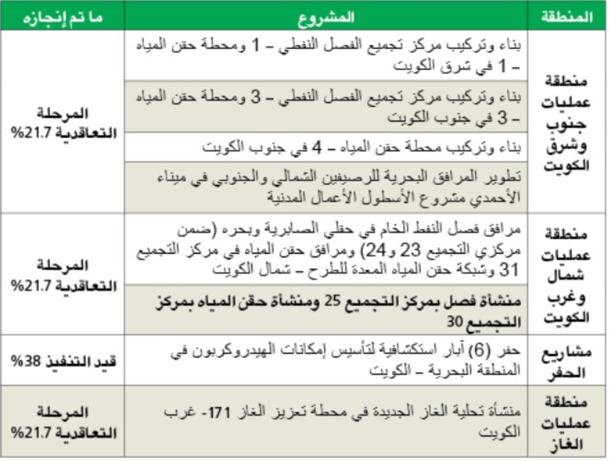 وذكرت البيانات: «كما تم الانتهاء من مشروع محطة وارة – المرحلة الثالثة في مايو 2024، وإصدار شهادة قبول الأداء في سبتمبر 2024، ما أدخل سعة إضافية لمناولة المياه بمعدل أعلى من 300 ألف برميل ماء مصاحب يومياً، الذي يسهم بدوره في زيادة الإنتاج في منطقة عمليات جنوب وشرق الكويت».
