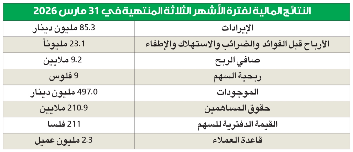 وأضاف: «أسفرت هذه النتائج عن نمو في الدخل قبل احتساب الفوائد والضرائب والاستهلاك والإطفاء بنسبة 3.5%، ليصل إلى 23.1 مليون دينار خلال الأشهر الثلاثة الأولى من عام 2026، مقارنة بـ22.3 مليونا في الفترة ذاتها من العام السابق، مدعوماً بجهود فرق العمل في تعزيز الكفاءة التشغيلية وتحسين هيكل التكاليف».
