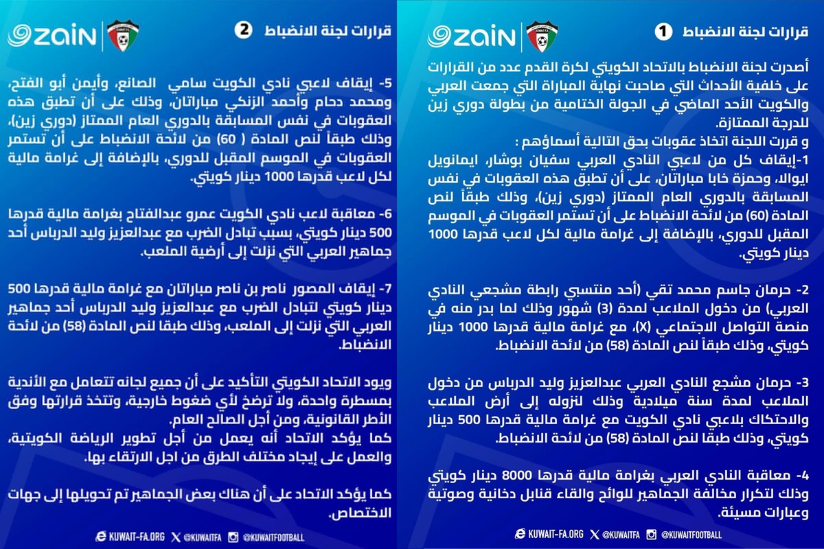 حرمان جاسم محمد تقي (من رابطة مشجعي النادي العربي) من دخول الملاعب لمدة 3 أشهر بسبب إساءات على منصة «X»، مع غرامة «1000 دينار كويتي»، وفق «المادة 58» من اللائحة.